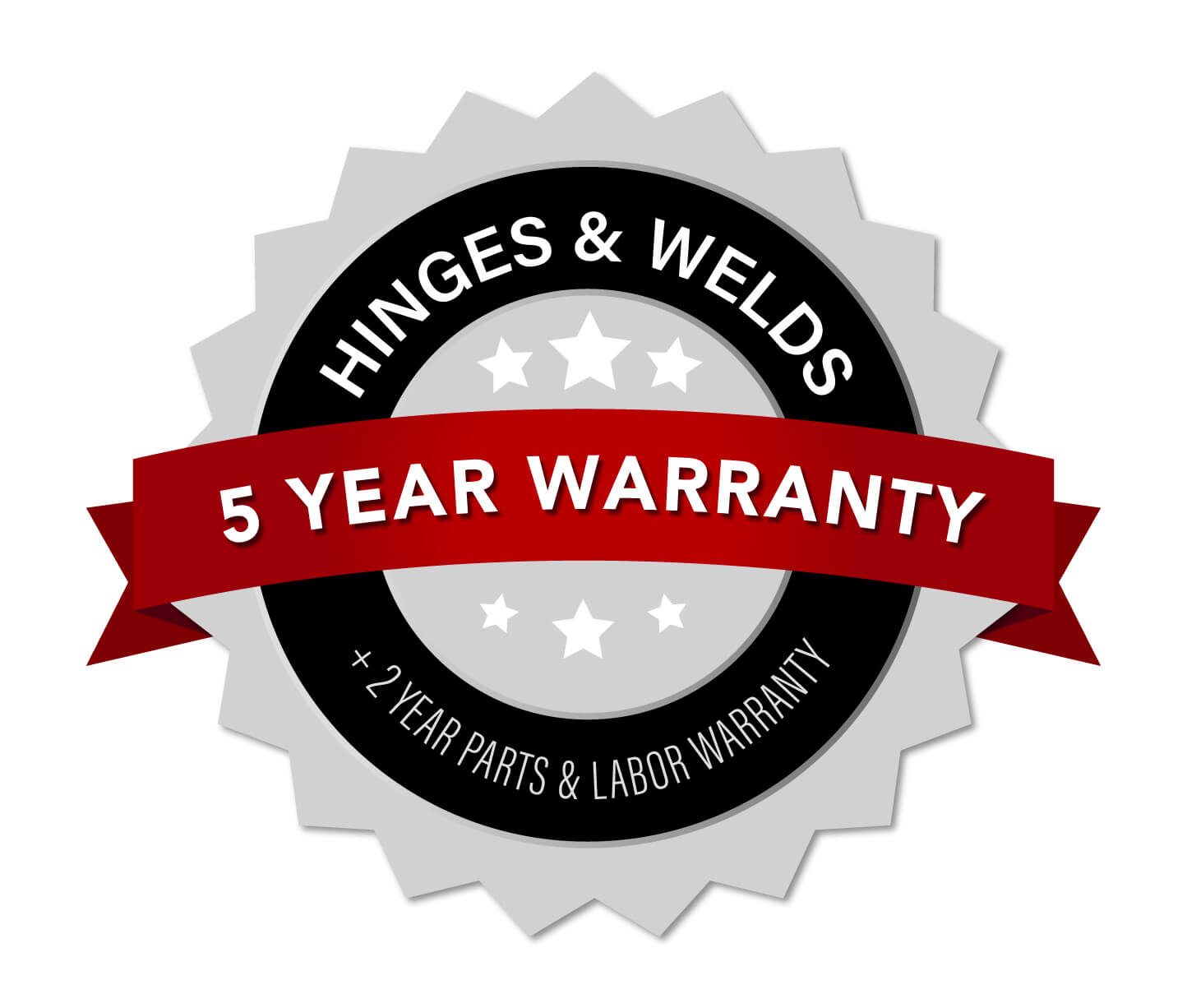 All hinges and welds come with a 5 year warranty, plus a 2 year parts and labor warranty.