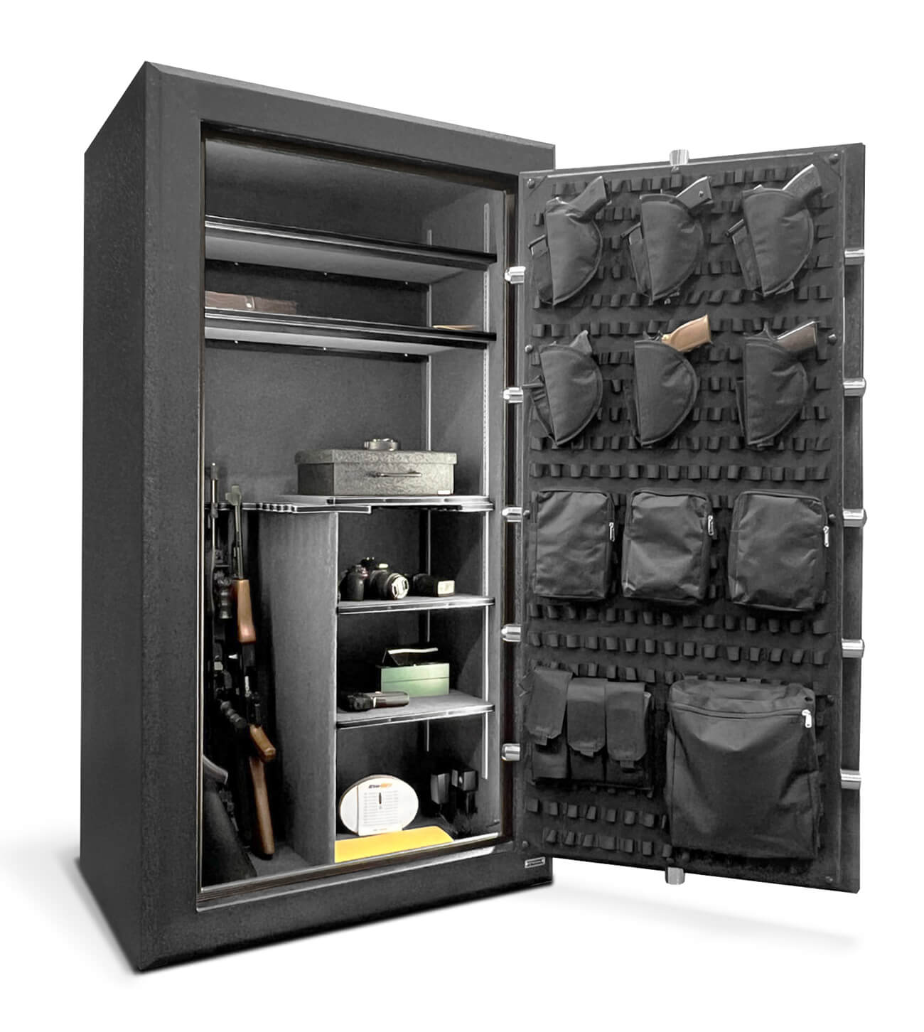 These Premier Gun Safes are styled with the extremely durable and unique Stealth Armored Black Finish. It comes with a black 5-spoke handle, a sleek finial pull handle that helps pull open the heavy door and beveled edges. Four bolt down holes and mounting hardware is included to secure the safe to the floor.