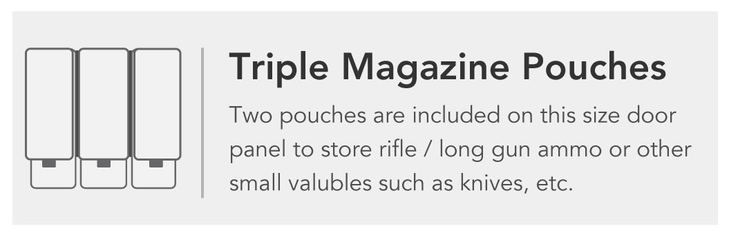 Standard on the medium size is 6 pistol holsters, 2 triple magazine pouches, 1 medium pocket and 2 large zippered pockets. All items include straps that weave into the Molle webbing and snap into place. Once your door panel is configured, you can easily unsnap the buttons and move the holsters and pockets at will to meet your exact specifications.