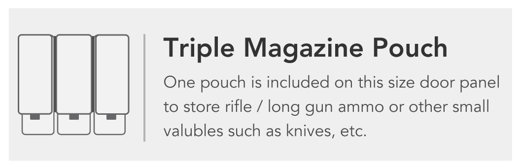 Standard on the small size is 3 pistol holsters, one triple magazine pouch, two medium pockets and one large pocket. All items include straps that weave into the Molle webbing and snap into place. Once your door panel is configured, you can easily unsnap the buttons and move the holsters and pockets at will to meet your exact specifications.