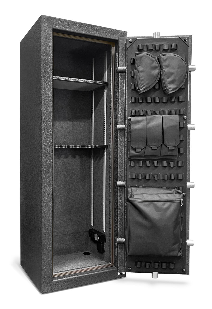 The Stealth UL14 gun safe includes the UL Approved NL UR-2020 High Security Electronic Lock standard. This lock is the most reliable lock in the safe industry and is assembled and tested in the USA. The lock is also protected by a hard plate and internal re-locker that will keep the bolts locked if a thief were to attempt a punch or drill attack. The S&G Mechanical lock and NL Redundant Lock are also available lock options.