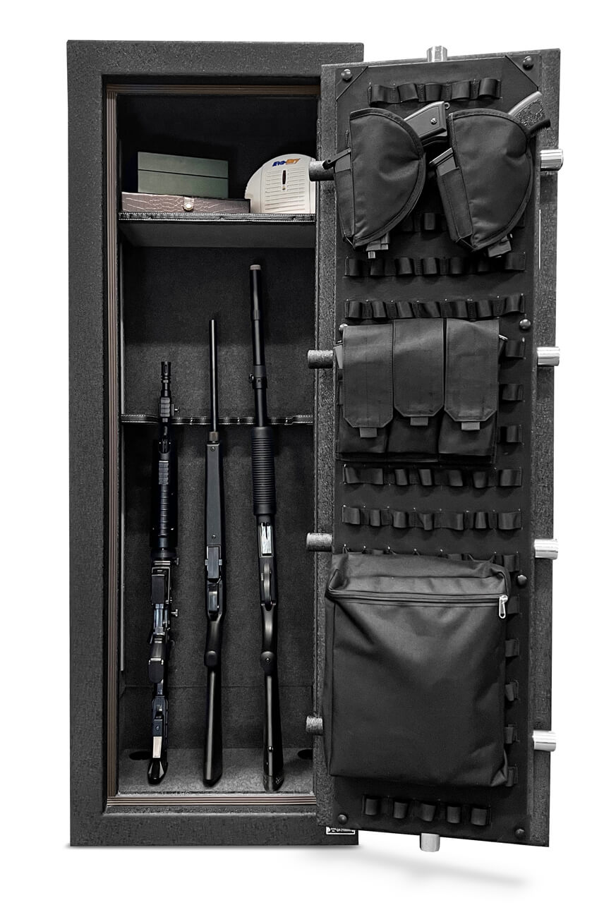 Unique to Stealth Gun Safes is the customizable Molle interior door organizer that helps free up additional space in the safe. This system is far better than sewn-in pockets as it allows for full customization. Want your pistol holsters at the bottom of the organizer? No problem. Want them lined up on the right side? No problem. Want to get rid of all the included accessories and use your own? Again, no problem! You can add and remove accessories as you need with the convenient strap and snap system.
